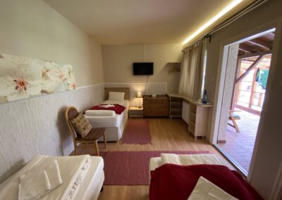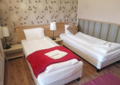 A vendégek 1-3 ágyas, fürdőszobás szobákban szállhatnak meg, akár 11 szobáig, nagyobb létszám esetén pedig külső partnereink segítségével biztosítunk további elhelyezést. A kulturált környezet és a szállodai minőségű ágyak garantálják a pihentető alvást, amit a csendes környezet tovább erősít.
